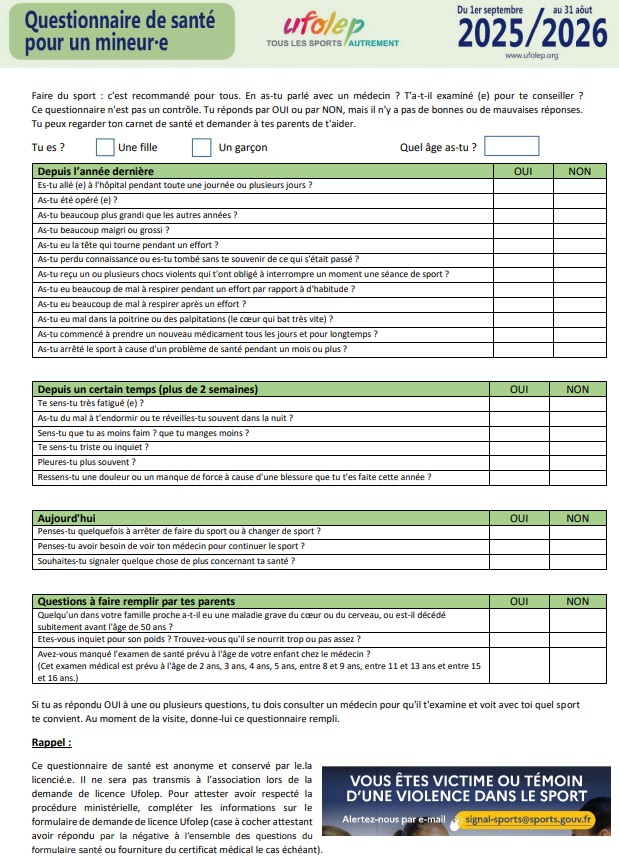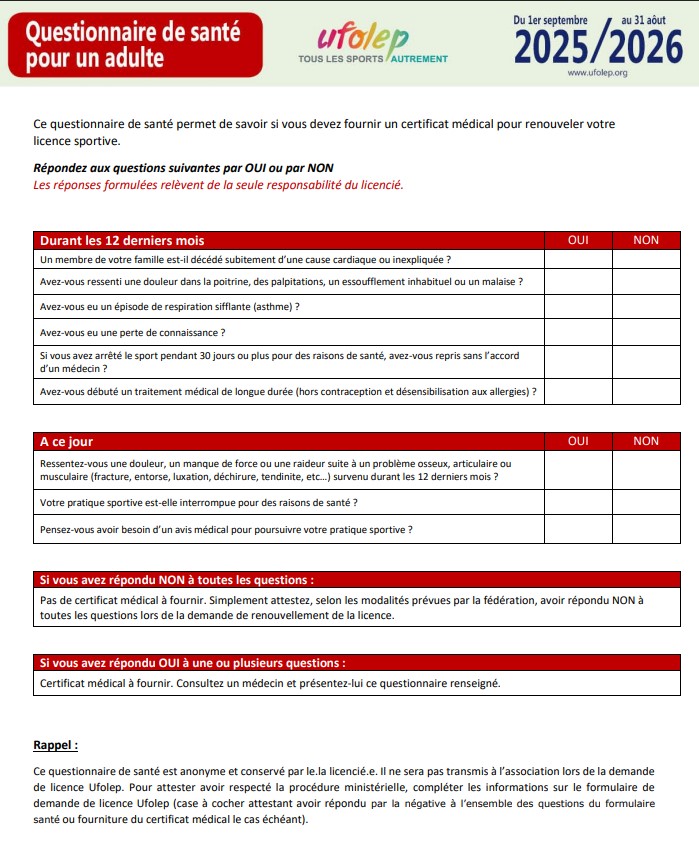 Pour toute création ou renouvellement de licence sportive (adulte et enfant), vous devez lire et répondre au questionnaire ci-dessous. Si vous répondez « OUI » à au moins une des question, vous devrez fournir un certificat médical.